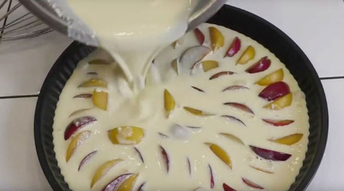 A szilvát megmossuk, kimagvaljuk és felszeleteljük. Egy kivajazott sütőformába, vagy tepsibe tesszük. Ne használjunk lekapcsolható oldalú sütőformát, mert a tészta nagyon híg lesz és kifolyna belőle. A tészta hozzávalóit egy tálba tesszük és összekeverjük, majd a szilvára öntjük.