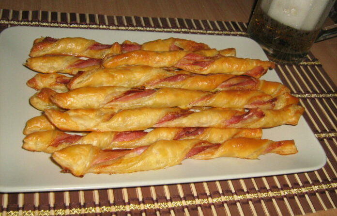 A leveles tésztát kiterítjük és kevés olvasztott vajjal átkenjük. A bacon szeleteket a tésztára tesszük, egymáshoz közel, majd megszórjuk a reszelt sajttal. A bacon szeletek mentén felvágjuk a tésztát, így hosszú rudakat kapunk. A tésztadarabokat összecsavarjuk és tepsibe tesszük. Felvert tojással megkenjük, majd 180 fokos sütőben nagyjából 25 perc alatt megsütjük.