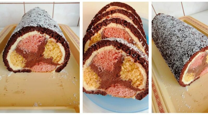 30 dkg vajat habosra keverünk 20 dkg porcukorral. Összekeverjük a kihűlt pudinggal, megfelezzük. Egyik marad fehér, a másikba 2 kanál kakaót keverünk. A sárga és rózsaszin tésztát hosszában kétfelé vágjuk, lesz 4 negyed darab. Barna krémmel összeragasztjuk. A nagy barna tésztát fehér krémmel megkenjük és a hengert beletekerjük. Egy éjszakát hideg helyen pihentetjük.