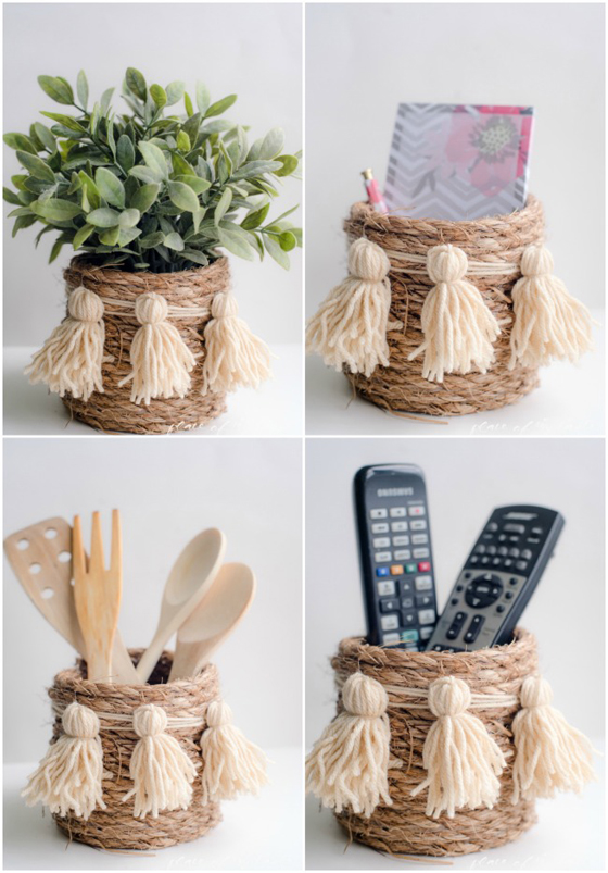 A mutatós tárolókosarak a boltokban vagyonokba kerülnek. Mi magunk is el tudjuk készíteni, így sokkal olcsóbb, olyan méretű és formájú, amilyet szeretnénk és remek elfoglaltság. Nem lesz másra szükséged, csak kötélre és ragasztópisztolyra, na meg egy kis türelemre.