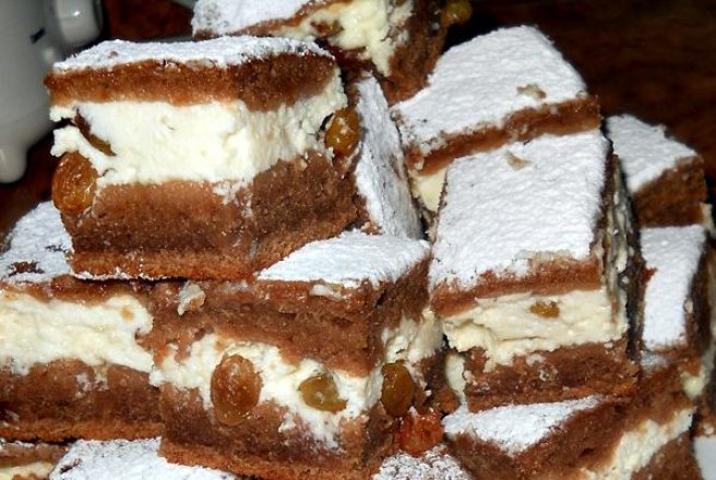 A tészta hozzávalóit egy tálba tesszük és robotgéppel összedolgozzuk egészen addig amíg krémessé válik. A tészta felét sütőpapírral kibélelt tepsibe öntjük és 10-12 percen át sütjük 180 fokon. Eközben a túrót összedolgozzuk a porcukorral, vaníliás cukorral és a tejföllel.Ízlés szerint tehetünk bele mazsolát. Kivesszük a sütőből a tésztát és ráhalmozzuk a túrót, majd rákanalazzuk a tészta második felét, ezt követően 20 percen át sütjük 180 fokon. A tepsiben hagyjuk kihűlni, közben a porcukrot a vaníliás cukorral összekeverjük és megszórjuk vele és már szeletelhetjük is.