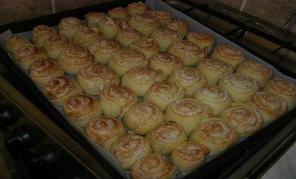 Ha jó kemény a hab, akkor adok hozzá 20 dkg kókuszreszeléket, és 1/4 részenként a kisodrott tésztára kenem. Feltekerem, mint a piskóta tekercset, és felszelem kb.2 cm-es szeletekre, nem túl szorosan tepsibe rakom. Én a tepsibe rakáskor egy ecsettel megkenem az oldalukat olvasztott vajjal, akkor könnyű őket szétvenni, mert össze fognak kelni, majd 180 fokos sütőbe teszem, kb.15 perc sütés után, mikor már van 1 kis színe, 1 csésze forró, vaníliás cukros tejet öntök rá, amiben van 5 dkg cukor is, hogy mindenhova nagyjából egyformán jusson, majd visszatolom a sütőbe.