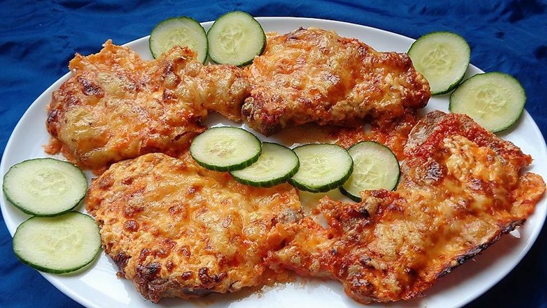 A vékonyra szeletelt húsokat a tepsibe terítjük. Mindegyiket bekenjük az Erős Pista és Piros arany keverékével, majd tejföllel is megkenjük. A tetejére jó vastagon reszelt sajtot szórunk.