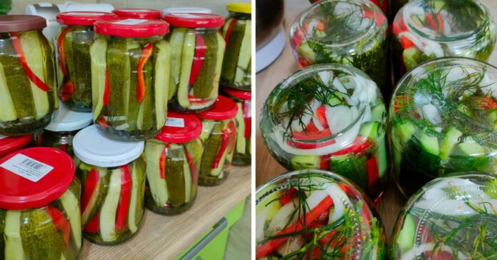 Az uborkát külön sós vízbe 1 percig kis adagonként abálom (egyszerre egy – két üvegnyit), az előkészített üvegekbe rakok egy kevés karikázott hagymát, kaprot, piros paprikát. Jöhet bele az uborka, amire ráöntöm a lobogó felöntőlevet, nagyon pici benzoátot teszek rá, csak biztonság kedvéért, de anélkül is lehet. Apró uborkát is így készítem. Nem kell dunsztolni, tehetjük a kamrába.