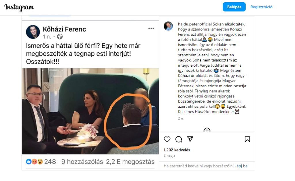 Hajdú Péter Instagram-oldalán reagált először a képen kialakult helyzetre, tagadva, hogy ő lenne a felvételen látható személy. Sőt, azt is hozzátette, hogy soha nem is találkozott Varga Judittal az interjú előtt, és nem is így néz ki hátulról.