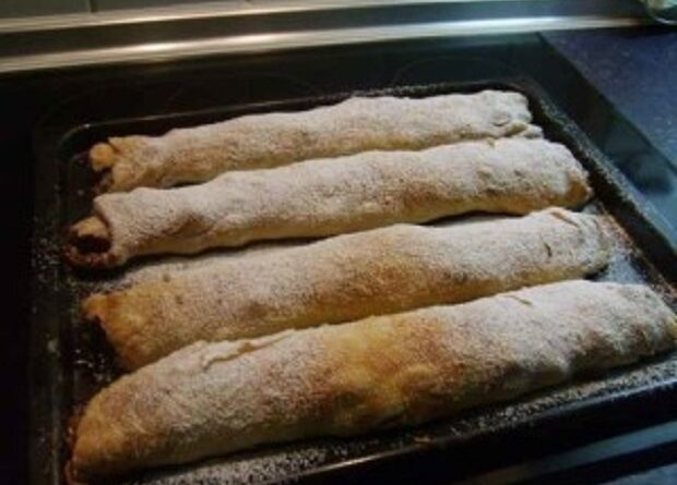Ezeket az anyagokat összegyúrjuk, majd vékonyra kinyújtjuk. 1 bögre lisztet 20 dkg margarinnal kikeverünk és a tésztára kenjük. Ezután feltekerjük, mint a beiglit és 8 felé vágjukA darabokból vékony téglalapokat nyújtunk kb. (12-13 cm széles), majd a kívánt tölteléket a közepén egy csíkban beletesszük. A végén a széleit ráhajtjuk egy kicsit, majd az alsó és felső szélét is. (úgy, hogy fedjék egymást).