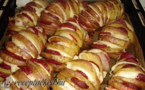 A közepes krumplikat, lehetőleg egyforma méretűeket megmossuk, kefével lesikáljuk. Ezután minden krumpliszemet bevagdosunk keresztben kb 3/4-ed részig 2-3 milliméter vastag szeletekre, de úgy, hogy a krumpli alja egyben maradjon.