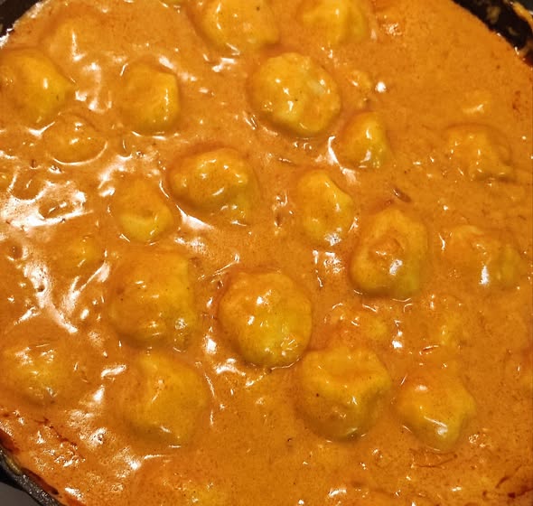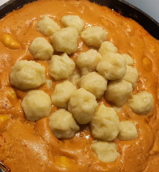 1 kg krumplit kockára vágunk, jó sós vízbe megfőzzük. Leszűrjük, összetörjük, beleütünk 2 egész tojást és annyi lisztet, amennyit felvesz. Kigolyózzuk, sós vízbe megfőzzük. Feljön a tetejére és pár percig főzzük, majd átszűrjük a mártásba. Én megspékeltem egy kis reszelt sajttal, de elhagyható.